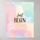 A gentle nudge to start where you are—this “Just Begin” quote design is set against a dreamy pastel watercolor background.