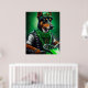 Un ami en fureur derrière les guidons d'une moto verte brillante, portant une tenue verte de la Saint Patrick qui fait tourner la tête. Le chien est habillé d'un ensemble festif, avec une cravate arc-en-ciel verte et un chapeau haut assorti qui se trouve doucement au-dessus de la tête. Le costume présente des motifs complexes de shamrocks et de leprechauns, ce qui indique clairement que ce chien est prêt à célébrer la Saint Patrick avec style.