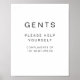 Cette enseigne de toilette mariage pour gents dispose d'une police serif propre et d'un design moderne minimaliste. Modifiez facilement les polices, les couleurs de police et la couleur arrière - plan pour qu'elles correspondent à votre style d'événement. La combinaison simple de couleurs noir et blanc en fait un complément parfait à tout événement. Utilisez ce poster pour votre réception de mariage, douche nuptiale, douche à couple, etc.