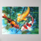 Trois koi brillants nagent dans un étang reflétant le brillant ciel bleu de novembre. Affiche d'une peinture originale aquarelle de Patricia Allingham Carlson.