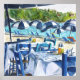 D'une peinture originale en acrylique, de Yvonne Ayoub, sur les chaises bleues Taverna, chaises longues et parasols à Kolios Beach, Skiathos, Grèce