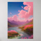 Une rivière se jette dans une vallée pittoresque, entourée d'herbes verdoyantes, de collines ondoyantes et de délicates fleurs roses. Le ciel au-dessus est inondé de tons rose et bleu, jetant une lueur sereine sur la scène à couper le souffle. Cette oeuvre d'art numérique capture la beauté dynamique de la nature, un ajout dynamique et tranquille à tout espace.