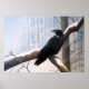 Corbeau assis sur une branche d'arbre. L'hiver et les arbres tout autour avec la neige tombant.