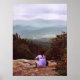 Cette affiche de voyage photographique d'art raffiné présente la photographie d'une des merveilleuses randonnées dans les Montagnes Blanches du New Hampshire. Un randonneur a suivi le sentier Nancy Pond jusqu'à la sortie de Norcross Pond qui offre des vues spectaculaires sur la nature de Pemigewasset, le mont Bond, la chaîne Twin Range et la chaîne de montagnes Franconia. Il a posé son bâton de randonnée sur les rochers et se repose sur une grande dalle de granit. Il porte un bandana rouge et une chemise violette lilas qui dit : Support Jazz. La vue est magnifique avec ciel et montagnes dans une gamme de couleurs bleu, vert et mauve.
