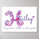 Jolie affiche de lettrage de monogramme artistique avec la lettre H, parfaite pour la chambre ou la salle de jeux d'une fille dans des nuances de rose et de violet. Personnalisez avec votre propre nom commençant par H et la signification du nom pour un toucher vraiment personnalisé pour la chambre ou la nurserie de votre fille. Cette affiche indique nom Hailey prairie de foin. Une petite vague, sauvage et pleine d'esprit. Jolie impression d'affiche idéale pour un nouveau-né, un baptême ou un cadeau de baby shower. © Unique dessin de monogramme de lettre H avec coeurs et fleurs et conception graphique par Sarah Trett. www.sarahtrett.com pour www.mylittleeden.com