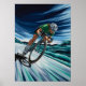 Une peinture à l'huile Art Déco dynamique qui capture une cycliste dans un maillot vert émeraude se penchant agressivement dans un virage, sa forme stylisée définie par une inclinaison hollandaise spectaculaire et un éclairage graphique croustillant contre un ciel d'indigo orageux.
