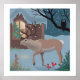 Le renne est le personnage central d'une scène nocturne hivernale avec un hibou, un lapin et deux cardinaux agissant comme support.