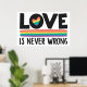Affiche du mois de la fierté LGBTQ avec la légende "L'amour n'a jamais tort" en noir toutes les polices casquettes décorées d'un petit coeur arc-en-ciel et d'une bande colorée sur un arrière - plan blanc.