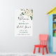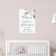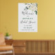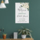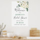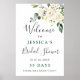 Accueillez vos invités à votre mariage avec l'Affiche de bienvenue pour la douche de la mariée aux roses blanches et à la verdure florale, avec une luxuriante verdure botanique à l'aquarelle et des fleurs blanches, avec "bienvenue dans notre bonheur éternel", vos noms et la date du mariage dans un mélange chic de caractères typographiques modernes et calligraphiés à la main.