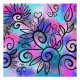 Un petit oiseau drôle dans le coin supérieur gauche et des éléments floraux sur un arrière - plan rose, violet et turquoise.