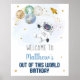 Bienvenue à vos invités de fête avec une adorable enseigne personnalisée. Encadrez le panneau et affichez-le sur une table près de l'entrée ou montez l'affiche en mousse et montez-le à l'extérieur sur un chevalet. Ce design adorable présente des planètes colorées avec des étoiles en feuille d'or.