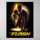 Regardez le Flash accroupi dans une position de départ de course, éclairs frappant le sol derrière lui.