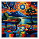 A.I.assistée d'un paysage surréaliste dynamique, dispose d'un piano à queue qui attend son pianiste, installé sur un terrain coloré à motifs géométriques. Le ciel est rempli de cercles tourbillonnants ressemblant à une nuit étoilée, et la scène est entourée d'une verdure luxuriante et d'une rivière sereine.