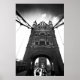 Une capture en noir et blanc du London Bridge avec une perspective unique "From the Ground Up" avec une capture des voitures solaires sous les énormes structures de ce pont emblématique