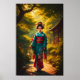 Un personnage gracieux d'une femme japonaise dans un kimono traditionnel turquoise époustouflant se promène sur un sentier baigné de soleil, entouré d'une lumière dorée lumineuse. Cette image saisit un moment de douceur et de sérénité, mettant en évidence les détails complexes du vêtement japonais traditionnel et du paysage naturel environnant, un morceau parfait pour quiconque apprécie l'art oriental classique et une touche de couleur lumineuse.