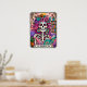 Design coloré et dynamique avec une carte tarot amusante avec un squelette féminin. Le squelette a des cheveux roses sauvages avec des fleurs dedans, un crâne de sucre, et tient un livre ouvert. Le texte coloré dit : "Le ver de bibliothèque". Ce design est disponible sur une grande variété de produits.
