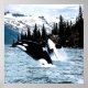 Deux épaulards sautants avant la nature sauvage de la côte de la Colombie-Britannique. Originellement en aquarelle.