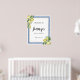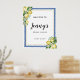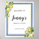 Le panneau de bienvenue idéal pour une fête de mariage sur le thème des citrons. Des citrons nichés dans des fleurs blanches et du feuillage vert sont entrelacés avec des carreaux bleus pour créer un cadre unique.