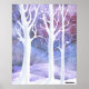 C'est un paysage hivernal abstrait avec des arbres blancs et des oiseaux et des nuances de violet dans les collines et le ciel arrière - plan. Une sorte de sentiment paisible et spirituel.
