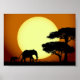 Cette illustration montre une mère éléphante avec son bébé éléphant, marchant à travers la savane africaine au coucher du soleil.
