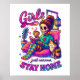 Design coloré et dynamique, avec un squelette féminin assis dans une chaise confortable avec son chat, lisant un livre et tenant une tasse de café. Le texte coloré dit : "Les filles veulent juste rester à la maison". Ce design est disponible sur une grande variété de produits.