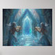 Deux sirènes aux cheveux argentés gardent un escalier cristallin qui mène à un sanctuaire sous-marin lumineux.