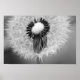 gros plan photo noir et blanc des graines de Dandelion. Certaines graines ont déjà soufflé, tandis que les graines restantes créent un cercle sur le coussin d'épingle blanche d'une tête de fleur.
