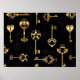 Seamless pattern of antique, gold and silhouette keys on black background.