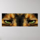 Les yeux verts d'un chat avec de minuscules étincelles en forme d'étoile regardent de ce poster. Sa belle fourrure brune et noire entoure les yeux.