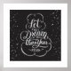 This poster features a classic Black background with petite stars in black, grey and white. Text reads " Let your dreams be bigger than your fears" with filigrees.