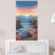 Lever de soleil pixélisé au-dessus de l'océan avec des falaises rocheuses décorées de coquillages et de coraux