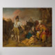 L'indignation de Gibeah (Juges 19 Retold) — 1 Un Lévite d'Ephraïm a voyagé avec sa concubine à Bethléem à Juda pour la ramener chez elle. — 2 Ils ont séjourné à Bethléem pendant plusieurs jours, profitant de l'hospitalité du père de la femme. Mais quand il fut temps de partir, le Levite pressa sa concubine de partir. — 3 "Viens," dit-il, "allons-y." — 4 Mais elle a refusé. "Non", a-t-elle plaidé, "restons une autre nuit. Mon père apprécie votre compagnie." — 5 Le Lévite a insisté pour qu'ils partent le soir. Ils atteignirent Jebus, comme Jérusalem fut alors appelée, comme le soleil commença à se coucher. — 6 Toujours impatients de rentrer chez eux avant la tombée de la nuit, les Lévites suggérèrent qu'ils se reposent là pour la nuit. — 7 Mais son serviteur dit : Nous ne pouvons pas rester dans cette ville étrangère. Continuons à Gibeah, un peu plus loin." — 8 Alors ils se sont rendus à Gibeah sur le territoire de Benjamin au crépuscule. — 9 Ne trouvant personne pour leur offrir un logement, ils se tenaient dans le carré de la ville. Enfin, un vieil homme des collines d'Ephraïm, qui séjournait à Gibeah, les vit et les invita chez lui. ...10 Les Lévites acceptèrent volontiers et ils suivirent le vieil homme dans sa maison, où il se lava les pieds, leur donnèrent un repas et leur offrirent un endroit où dormir. — 11 Alors que la soirée s'approchait, un groupe d'hommes méchants de Guibea encerclait la maison, tapant sur la porte et criant au vieil homme. — 12 "Sortez l'homme qui est venu pour rester avec vous", demandèrent-ils. "Nous voulons l'avoir." — 13 Horrifiés, le vieil homme leur a supplié : "Non, mes amis, ne faites pas une chose si maléfique ! Il est sous mon toit. Ne commettez pas un acte aussi honteux !" — 14 Mais les hommes n'écoutaient pas. En désespoir de cause, le vieil homme leur offrit sa propre fille vierge et la concubine du Lévite, en leur disant : "Faites ce que vous devez avec eux, mais laissez ces hommes seuls, car ils sont sous ma protection." — 15 Consommés par la convoitise, les hommes ignorèrent les suppliques du vieil homme. Ils ont saisi la concubine et l'ont traînée dehors, l'agressant toute la nuit jusqu'au matin. — 16 A l'aube, complètement brisée, la concubine est retournée à la porte de la maison et s'est effondrée. — 17 Le matin, le rose Lévite, voyant sa concubine couchée à la porte, les mains encore sur le seuil, pensait qu'elle dormait simplement. — 18 "Lève-toi, dit-il, il est temps d'y aller." Mais il n'y a pas eu de réponse. Il réalisa avec horreur qu'elle était morte. — 19 Il plaça son corps sur son âne et partit pour la maison, son coeur lourd de chagrin et de rage. — 20 Arrivé chez lui, il coupa le corps de sa concubine en douze morceaux et les envoya à travers le pays d'Israël, avec un message : "Regarde ce qui a été fait à ma concubine ! Une telle indignation n'a jamais été vue en Israël !" — Cette oeuvre est du domaine public de son pays d'origine et d'autres pays et zones où la durée du droit d'auteur est la vie de l'auteur plus 100 ans ou moins. — Gerbrand van den Eeckhout (1621-1674), artiste hollandais de l'âge d'or, était un élève vedette de Rembrandt. Il maîtrise des peintures d'histoire, des portraits et des scènes de genre, connus pour son mélange du drame de Rembrandt avec l'élégance flamande. Son "Lévite et sa Concubine" est un exemple célèbre