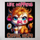 A funny and sarcastic design showcases a cute highland cow sitting with a beautiful white daisy and a to-go coffee cup. The cow, with big blue eyes and a serious expression, sports a lipstick kiss on his cheek and vibrant orange-and-white fur. The colorful text reads, "Life happens, coffee helps." This design is available on various products, making perfect gifts for coffee lovers.
