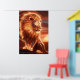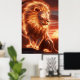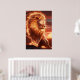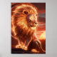 Une scène cosmique fascinante avec un lion céleste, fabriqué à partir de lumière tourbillonnante et énergique. Les yeux du lion brûlent avec éclat et éclat, tandis que sa magnifique crinière dorée et sa fourrure brille d'une brillance intense et ardente. Perchée sur un terrain rocheux, la créature majestueuse se dresse comme un phare de l'énergie primitive. Le soleil se couche dans l'arrière - plan, baignant le paysage dans des teintes chaudes et riches d'orange et de rose, évoquant un sentiment d'émerveillement et d'émerveillement.