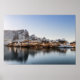 Photographie de paysage de maisons traditionnelles norvégiennes dans un village de pêcheurs de la côte de Lofoten, au nord de la Norvège.