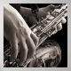 Cette peinture à l'huile hyperréaliste extrêmement détaillée de Jeff Bartels représente un homme qui joue du saxophone. L'image, en noir et blanc, qui est recadrée, montre la main gauche de l'homme au premier plan avec sa main gauche vers le haut dans l'arrière - plan. Une lumière forte et des ombres, ainsi que la culture serrée donnent à ce tableau une sensation frappante et dramatique.