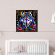 La tête de loup stylisée de façon frappante, caractérisée par des motifs complexes et des couleurs vives. La fourrure du loup est principalement un mélange de bleu et de blanc, avec des accents orange vif qui mettent en valeur le visage et les oreilles. Autour du cou, une chaîne décorative apporte une touche de décoration. L'arrière - plan est orné de différentes formes colorées, cristaux et feuilles, qui rehaussent l'aspect mystique et artistique général de la pièce. De plus, des éléments décoratifs tels que des perles et des ornements pendent des côtés, contribuant à une atmosphère bohème.