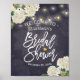 Modèles de pancarte de bienvenue pour la Baby Shower de mariage - Fleurs d'hortensia blanches élégantes et lumières de guirlande sur fond de lin floral bleu marine vintage.