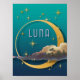 Luna, une illustration numérique de collage, représente le ciel nocturne avec étoiles, lune et nuages. Les images de nuages et de lune ont été coupées d'une carte de commerce antique originale et mariées à des étoiles modernes. Le motif pointillé antique a été transféré à la surface des étoiles, unifiant l'ancien et le nouveau. L'ombre douce ajoute de la profondeur à l'image. Une bordure striée de bleu profond et de violet pâle vient compléter les couleurs dorées et turquoise de l'image primaire et donne de l'énergie à l'illustration.
