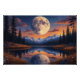Une lune géante domine le ciel nocturne, illuminant les montagnes enneigées et réfléchissant sur un lac calme. De grands arbres encadrent les rives, tandis que des nuages oranges et bleus peignent l'horizon. Les étoiles scintillent, créant une scène magique qui transmet la paix et l'émerveillement. Parfait pour évoquer les rêves et les liens avec la nature sauvage, cette oeuvre allie beauté céleste et tranquillité terrestre en un seul instant.