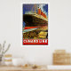 affiche vintage de la ligne Cunard montrant une vue arrière de la RMS Lusitania à quatre cheminées embarquant de la jetée.
