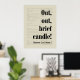 Immergez-vous dans le monde sombre et hantant de la Macbeth de Shakespeare avec cette oeuvre d'art méticuleusement artisanale, avec la citation iconique "Sortie, sortie, brasse bougie !" affichée en évidence dans une typographie élégante. Cette ligne puissante, prononcée par Macbeth dans l'Acte 5, Scène 5, saisit l'essence de la pièce d'exploration de la nature éphémère de la vie et de l'inévitabilité de la mort. L'arrière - plan de cette pièce intègre subtilement le passage correspondant de la pièce, ajoutant une couche de profondeur et de contexte littéraire qui résonnera avec n'importe quel amoureux de la littérature classique. Le design de cette oeuvre d'art équilibre magnifiquement la révérence historique et l'esthétique moderne. La citation principale se distingue par une typographie audacieuse et raffinée contre un arrière - plan qui évoque la texture et l'apparence d'un manuscrit ancien. L’écriture délicate du passage de la pièce, rendue dans une police intemporelle, améliore l’authenticité de l’oeuvre et attire le spectateur dans le monde complexe du drame de Shakespeare. Cette interaction harmonieuse de textes et d'éléments de design crée une pièce visuellement étonnante qui est à la fois stimulante intellectuellement et esthétique. Idéal pour les amateurs de littérature, les chercheurs de Shakespeare et les amateurs d’art, cette oeuvre d’art est plus qu’une simple pièce décorative, c’est une célébration de l’une des oeuvres les plus profondes et les plus durables de la littérature anglaise. Qu'il soit exposé dans une étude, une bibliothèque ou un salon, il est sûr d'inspirer une réflexion réfléchie et de susciter des conversations sur les thèmes intemporels de l'ambition, du pouvoir et de la mortalité à Macbeth. Cette pièce est un cadeau réfléchi pour quiconque apprécie la beauté et la complexité de l’écriture de Shakespeare.