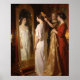 Une femme se tient debout devant un miroir orné, son reflet montrant les détails raffinés de sa tenue. Deux autres l'assistent, créant une scène de grâce et de raffinement.