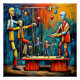 A.I.assisté l'impression d'un maître de marionnettes surréaliste et décalé avec des caractéristiques exagérées tire les cordes de ses marionnettes les faisant marcher et danser en les lisant pour leur performance sur scène.