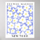 Poster du marché aux fleurs avec le nom modifiable de la ville et de grandes marguerites blanches simples avec centre jaune sur bleu texturé pour un décor maison tendance