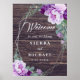 Voici une option étonnante pour accueillir vos invités à votre fête mariage. Ce design présente d'élégantes pivoines et des bourgeons roses dans les tons violets, lavande et violet ainsi que de la verdure tendance du feuillage d'eucalyptus. Vos détails de mariage facilement personnalisées sont entourés d'une bordure géométrique fausse feuille d'argent. Le tout sur un arrière - plan en faux bois de barnwood à la campagne. Veuillez me contacter si vous souhaitez voir cette conception sur une affiche de plus de 18"x24". Si vous avez une question de design ou souhaitez voir ce design sur un autre produit, n'hésitez pas à m'envoyer un message sur Zazzle. Design © Judith Schmidt.