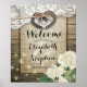 Modèles de pancarte de bienvenue de mariage de campagne de tournesol en fer à cheval - Couple vieux fer à cheval cœur avec nœud de corde et dentelle blanche, fleur d'hydrangea, lumières de corde et tissu de toile de jute sur fond de bois de grange ancien. Un design parfait pour votre grand jour. Tous les styles de texte, couleurs et tailles peuvent être modifiés pour répondre à vos besoins !
