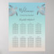 Elégante tortue de mer argentée sur fond sable turquoise/beige. Panneau de bienvenue mariage avec les noms de mariés et de mariés personnalisés et une liste de sièges pour 80 invités. Produits Mariages correspondants disponibles.