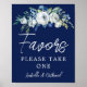 La soirée florale Gras bleu marine et blanc pivoine privilégie l'affiche pour un mariage d'hiver moderne. Un élégant spray botanique de feuilles verts se déroule au-dessus du script blanc manuscrit branché pour un magnifique panneau moderne d'événement pour votre événement. S'il vous plaît, prenez une faveur.