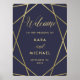 Ce panneau d'accueil de mariage moderne et élégant présente une forme géométrique en faux or tendance et une calligraphie sophistiquée sur un arrière - plan bleu marine.